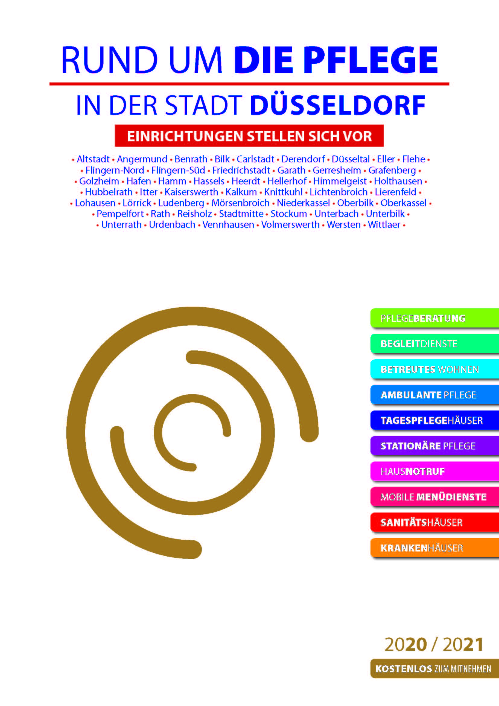 Die Broschüre „RUND UM DIE PFLEGE“ erscheint seit 2011 in der Städteregion Aachen und im Kreis Düren. Jetzt möchten wir das gleiche Konzept nach Düsseldorf bringen. Die Broschüre präsentiert Ihnen die Anschriften und Telefonnummern der Einrichtungen und Firmen in übersichtlichen Verzeichnissen, damit Sie hingehen und sich direkt vor Ort informieren oder per Telefon beraten lassen können. Weiterführende Informationen finden Sie jeweils in den Anzeigen.